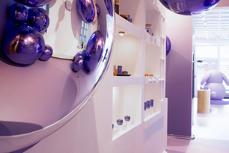 To celebrate the launch of their new Dewy Milk Moisturizer, Tatcha tapped Mother Sauce to concept, design, and produce a multi-day experiential pop-up in the heart of SoHo. Part retail space, part experiential, the pop up was crafted to capture and highlight the key skin benefits of the product: bounce, weightless, and glow. The creative direction brought together these concepts along with the joyful spirit of Jiyū Chan, Tatcha’s new bouncing bunny character, and of Olympic gold medalist Suni Lee, the face of the campaign. The result was a tactile, plush world where skincare met story, and play met performance. Guests were greeted by a 5-foot-tall Jiyū Chan, custom bouncy inflated walls in Tatcha’s signature brand hues, and a claw machine filled with mini skincare treasures. A photo moment reimagined bounce house aesthetics through an artistic lens, filling the room with Tatcha purple bouncing globes suspended from the ceiling and walls to create a artful and airy backdrops for the video booth.